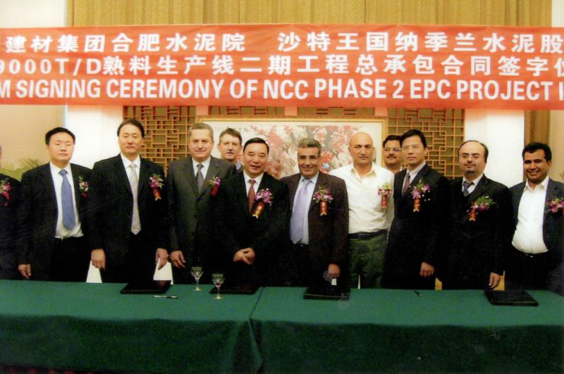 2005年7月20日,合肥院與沙特NAJRAN水泥公司簽訂了6000td水泥熟料生產(chǎn)線合同。這是合肥院承接的第一個(gè)EPC模式的總承包工程,是當(dāng)時(shí)國(guó)內(nèi)規(guī)模最大的水泥出口項(xiàng)目,也是沙特國(guó)內(nèi)最大的水泥生產(chǎn)線工程。2006年2月,合肥院與項(xiàng)目業(yè)主沙特納吉蘭水泥公司簽訂9000tpd熟料生產(chǎn)線二期EPC合同。上圖為簽約現(xiàn)場(chǎng)合影,下圖為合肥院施工人員在項(xiàng)目現(xiàn)場(chǎng)合影。
