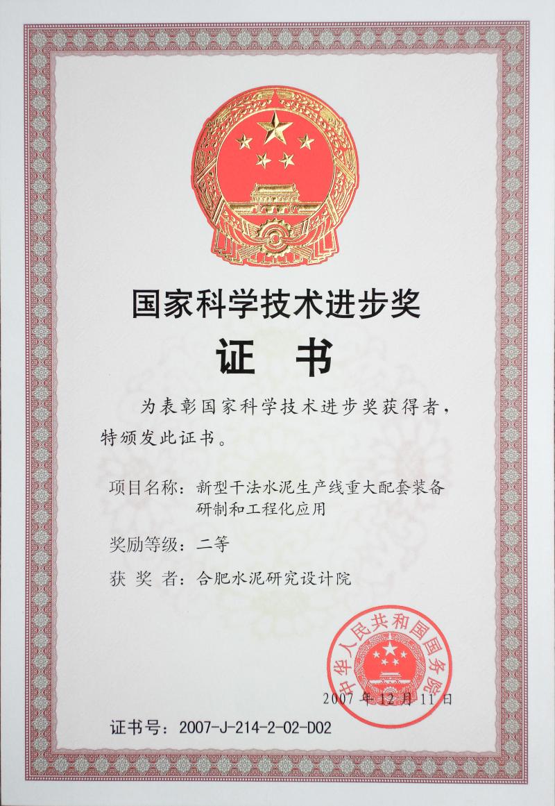 2007年,《大型新型干法水泥生產(chǎn)線配套裝備研制與應(yīng)用》獲得國(guó)家科技進(jìn)步二等獎(jiǎng)。這是該年度我國(guó)建材行業(yè)唯一獲得國(guó)家科技進(jìn)步獎(jiǎng)的項(xiàng)目。