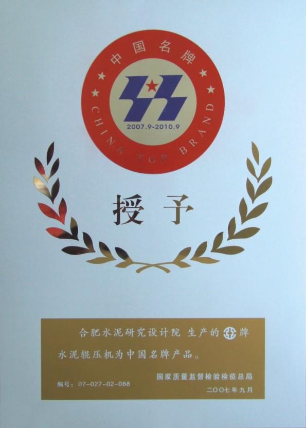 2007年9月11日,合肥院HFCG系列輥壓機(jī)產(chǎn)品榮獲“中國(guó)名牌產(chǎn)品”稱號(hào),開創(chuàng)了建材行業(yè)科研院所自主研發(fā)和制造的產(chǎn)品獲“中國(guó)名牌”的先河