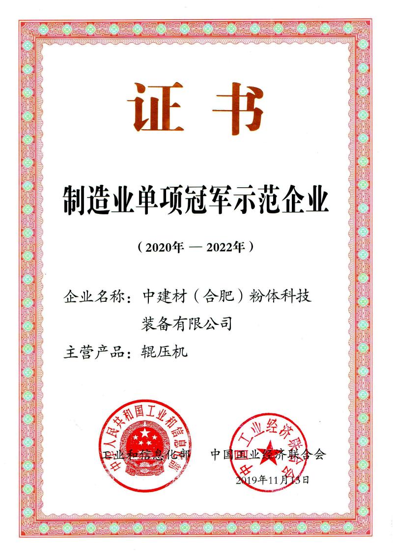 中建材(合肥)粉體科技裝備有限公司前身為合肥水泥研究設(shè)計院粉磨研究所,2011年8月,經(jīng)合肥水泥研究設(shè)計院粉體工程公司與肥西節(jié)能設(shè)備廠聯(lián)合改制組建而成,國家高新技術(shù)企業(yè),全國首批“制造業(yè)單項冠軍示范企業(yè)”,中國建材集團“六星企業(yè)”。